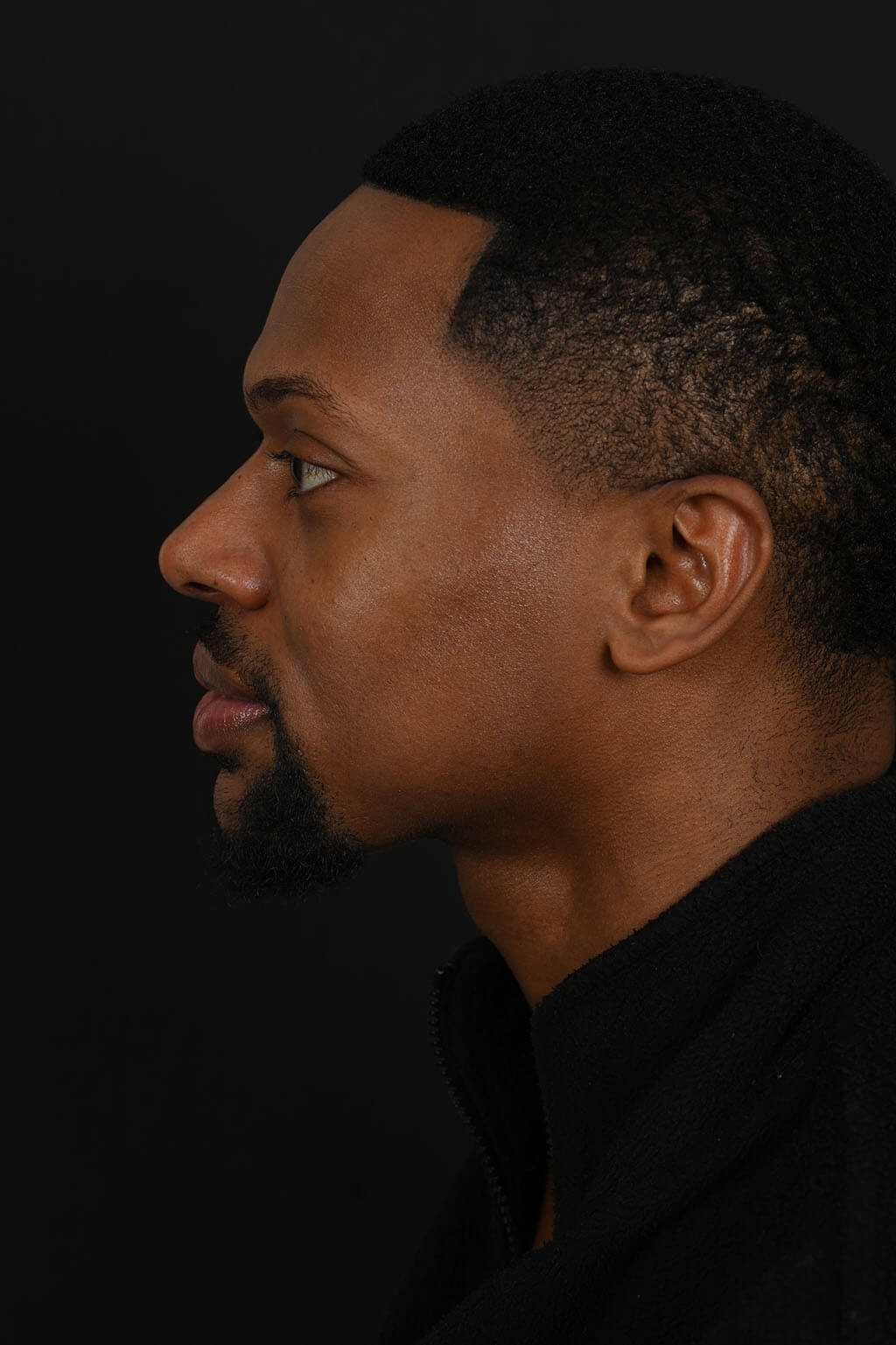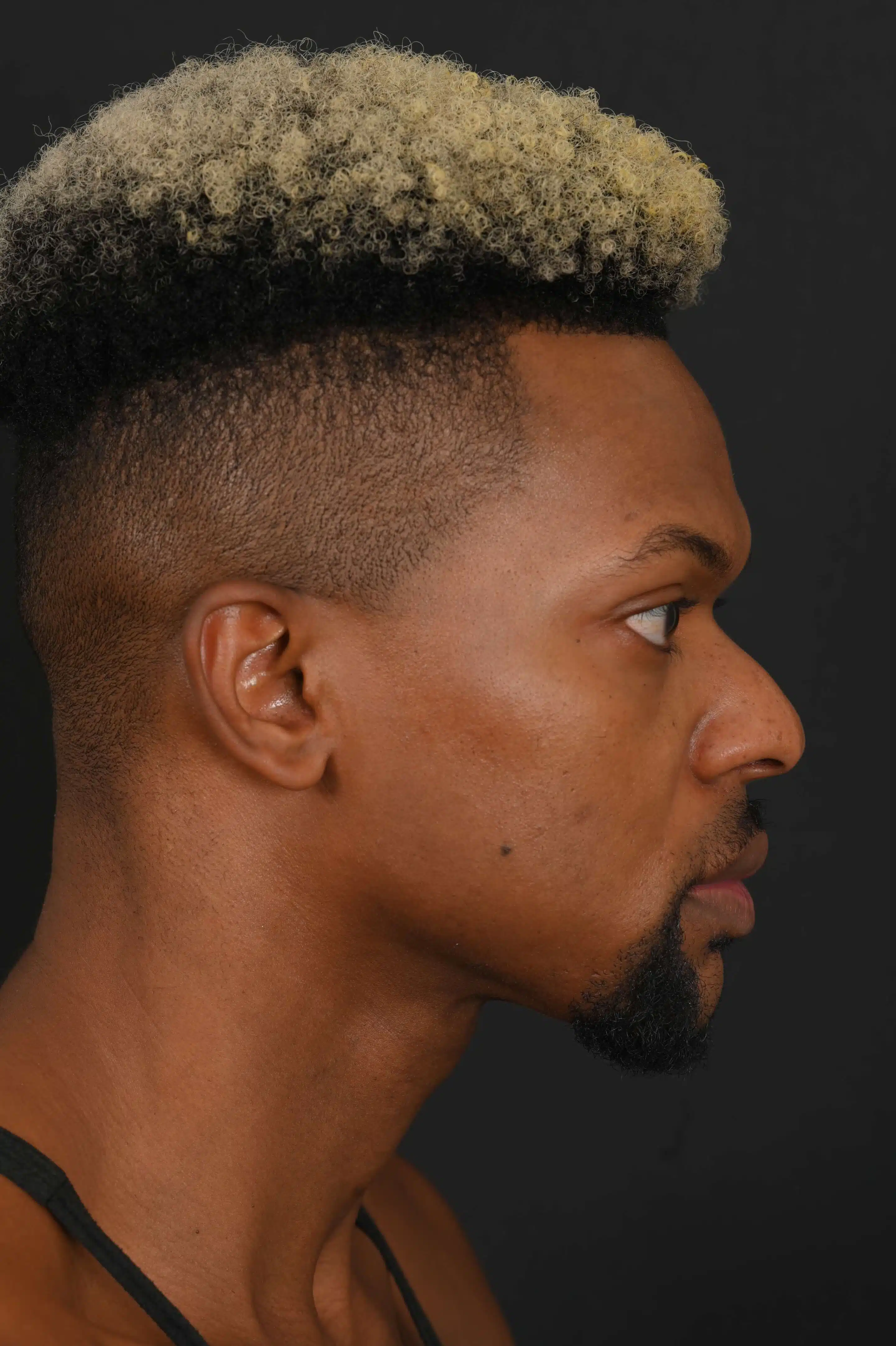 Notes from Dr. Siegel: Our patient disliked his bifid tip (split vertical line) and wide nostrils in front view. On the profile, he had a large dorsal hump, and deep radix (space between the nose and the forehead). His nostrils were narrowed with an alar base reduction, and the bifidity of the tip removed. Rhinoplasty gave him the profile he wanted by eliminating the hump and softening the transition point between the nose and the forehead.