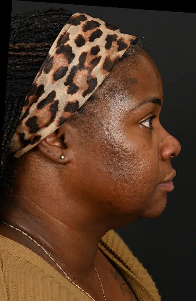Notes from Dr. Siegel: Our patient had very thick skin and was bothered by her very flat and wide nose. Cartilage was used to create a higher bridge and create a slimmer appearance. The tip was projected to create more definition, and her nostrils were narrowed.