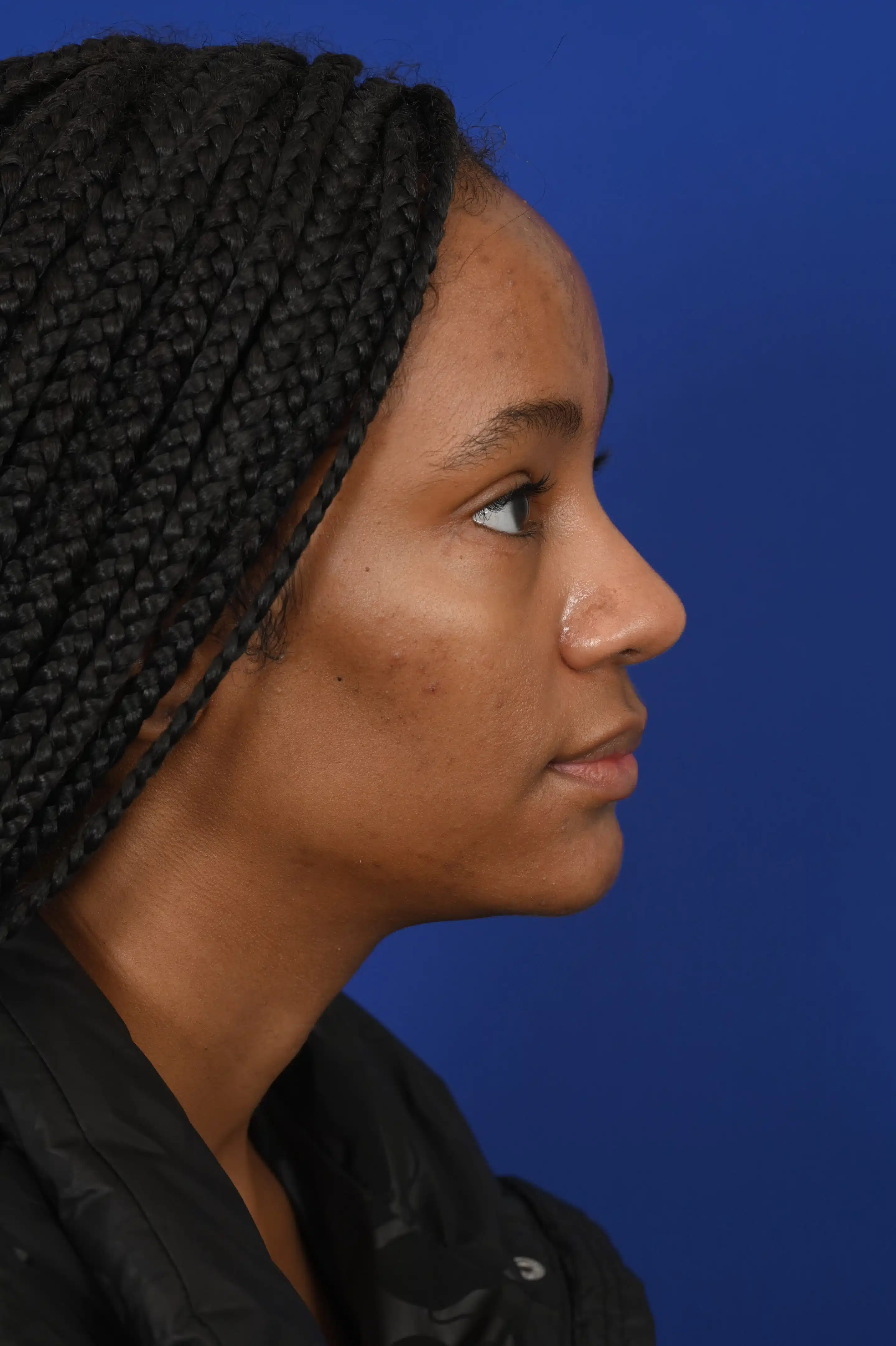 Notes from Dr. Siegel: This African American woman was mostly bothered by the appearance of her nose from the front: Her wide nasal bones, her bulbous tip, and the overall width of the nasal tip. She wanted a subtle refinement from her side view – mainly a hump reduction and mild tip elevation. Her overall goal was changes that would maintain her ethnic identity. We performed an ultrasonic rhinoplasty to narrow her nasal bones and provide a narrower nasal appearance on the front view. Her tip was reshaped to achieve a less-round, more defined appearance. Her nostrils were slightly narrowed via an alar base reduction with “invisible” incisions.