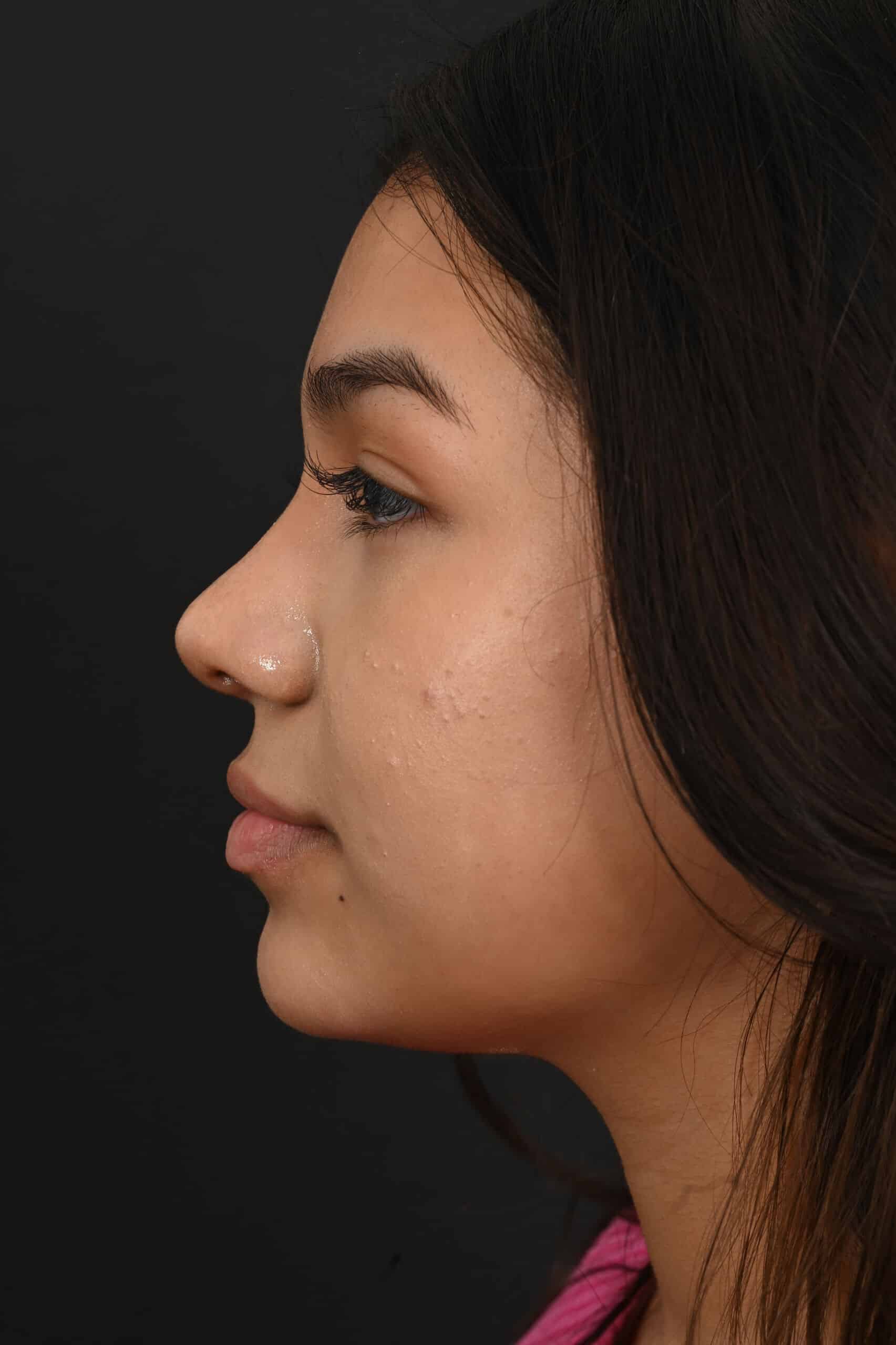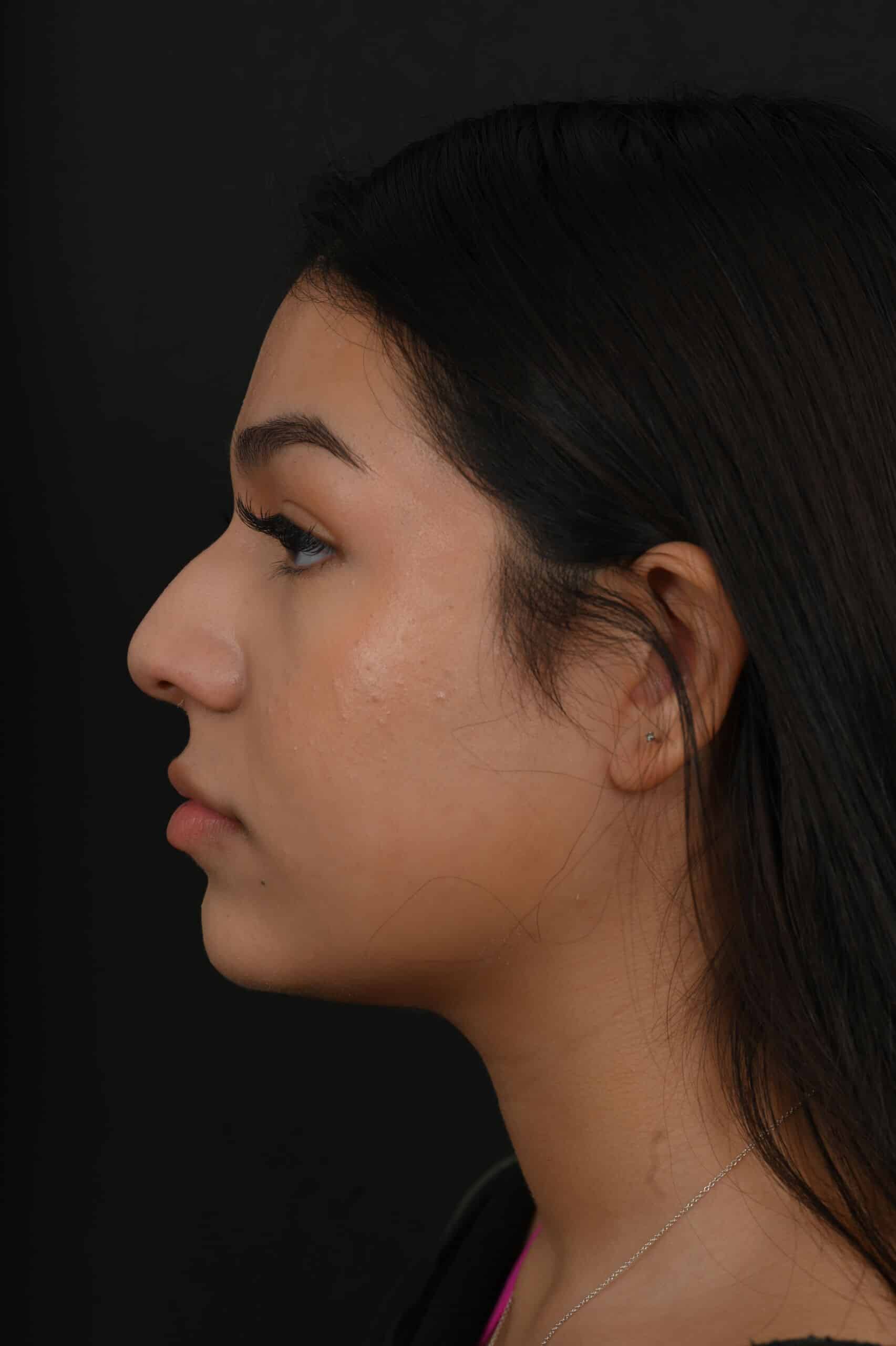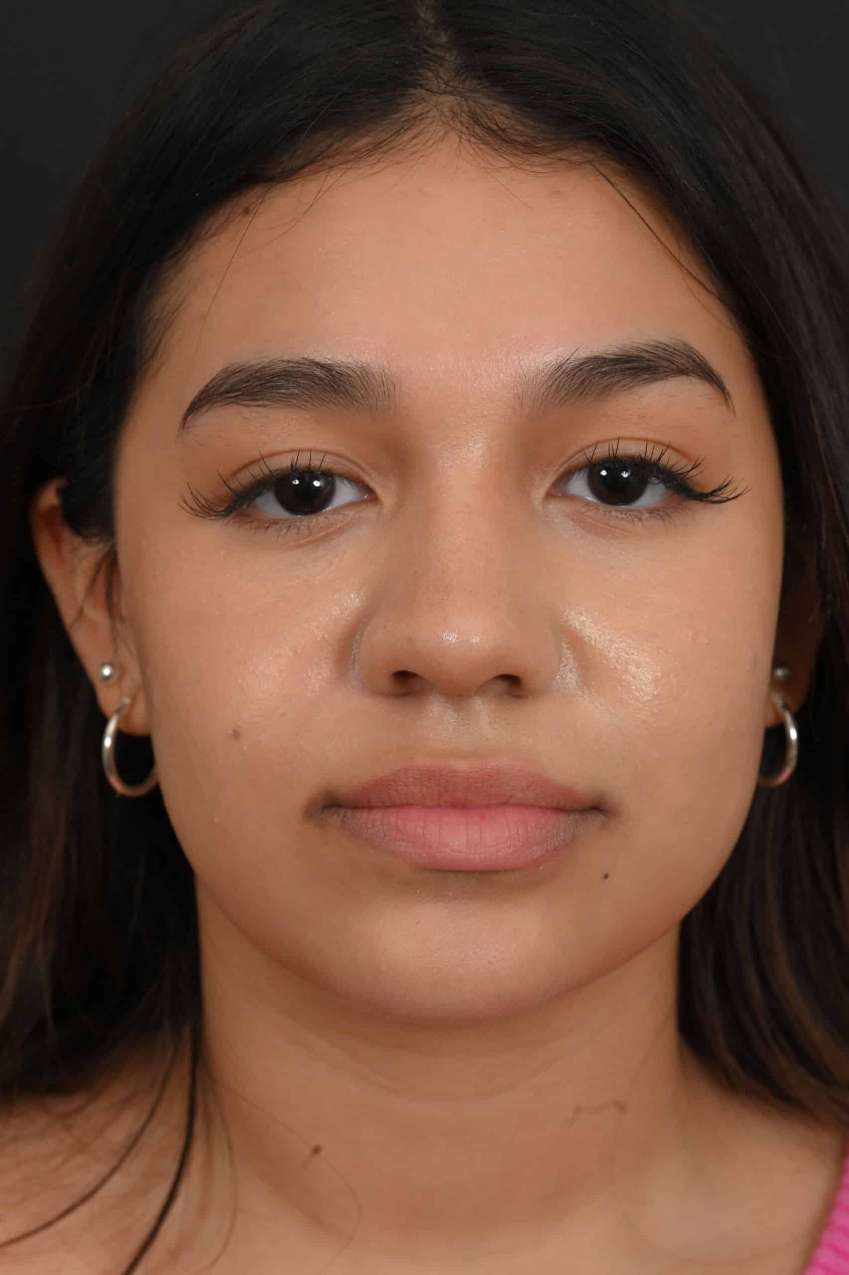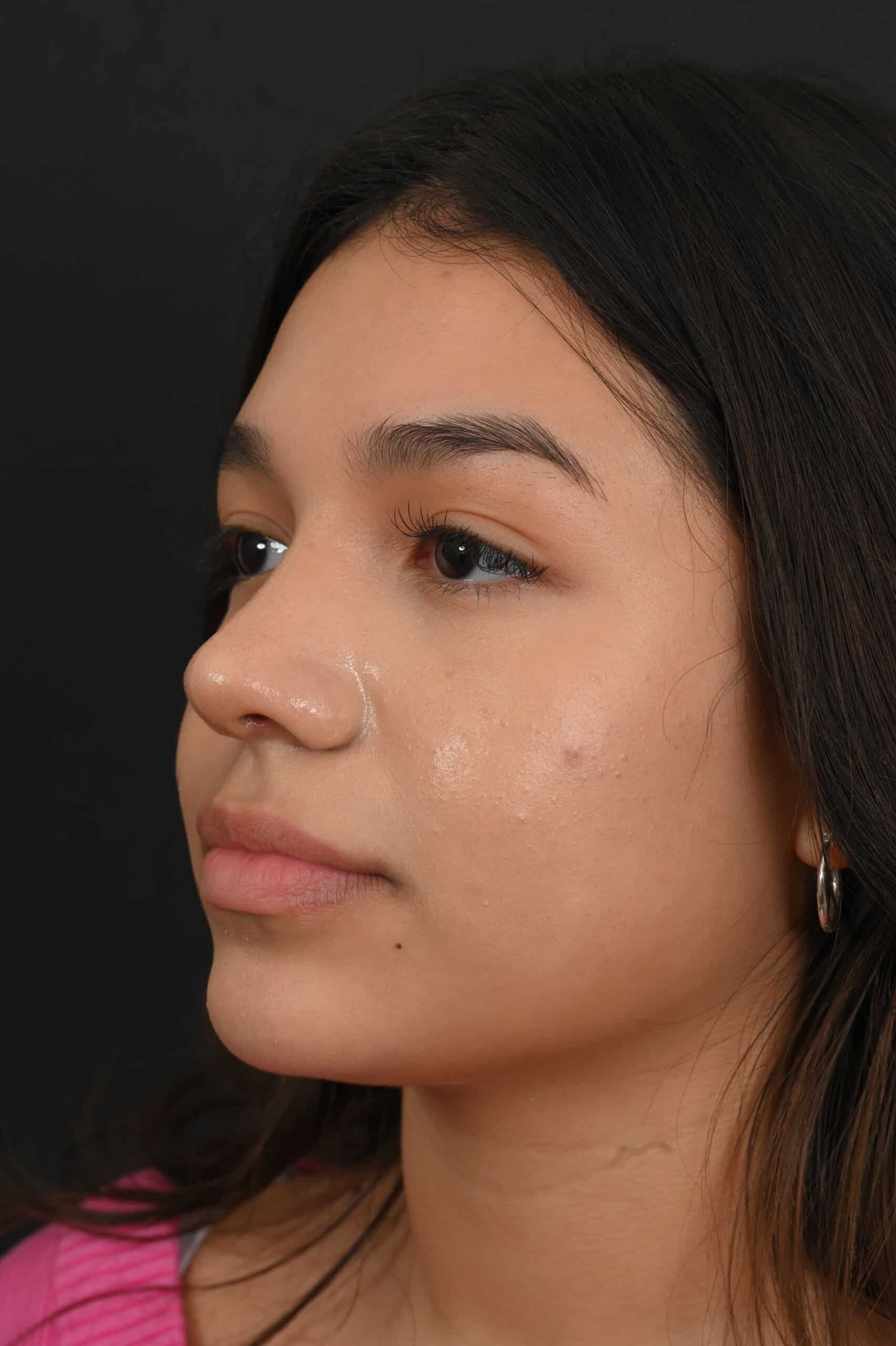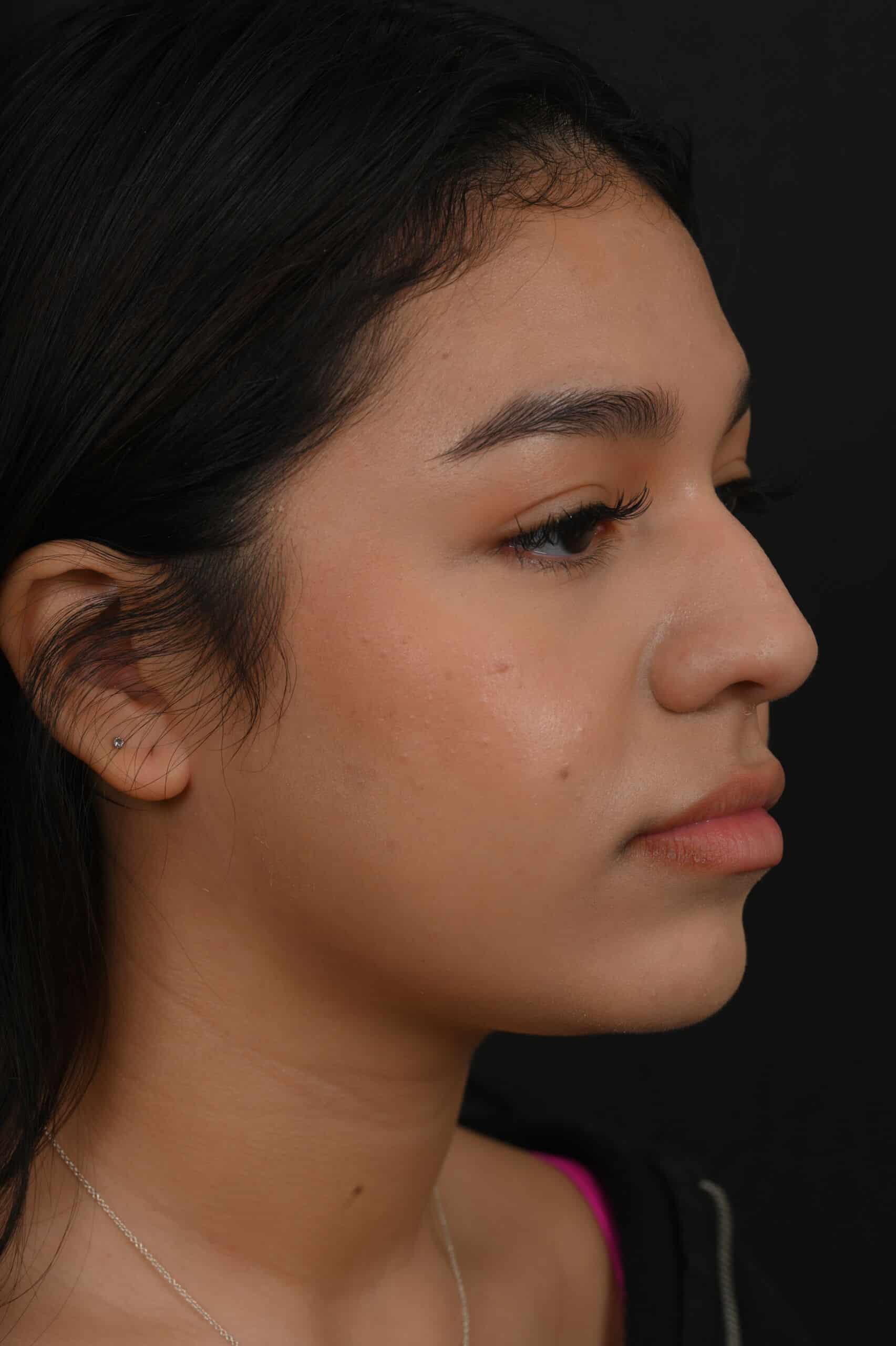 Notes from Dr. Siegel: Our Hispanic patient had thick skin, and was bothered by the lack of tip definition and a large dorsal hump, Her nose was also crooked. Her rhinoplasty straightened her nose and improved her breathing. The hump was removed and the tip was sculpted and refined.