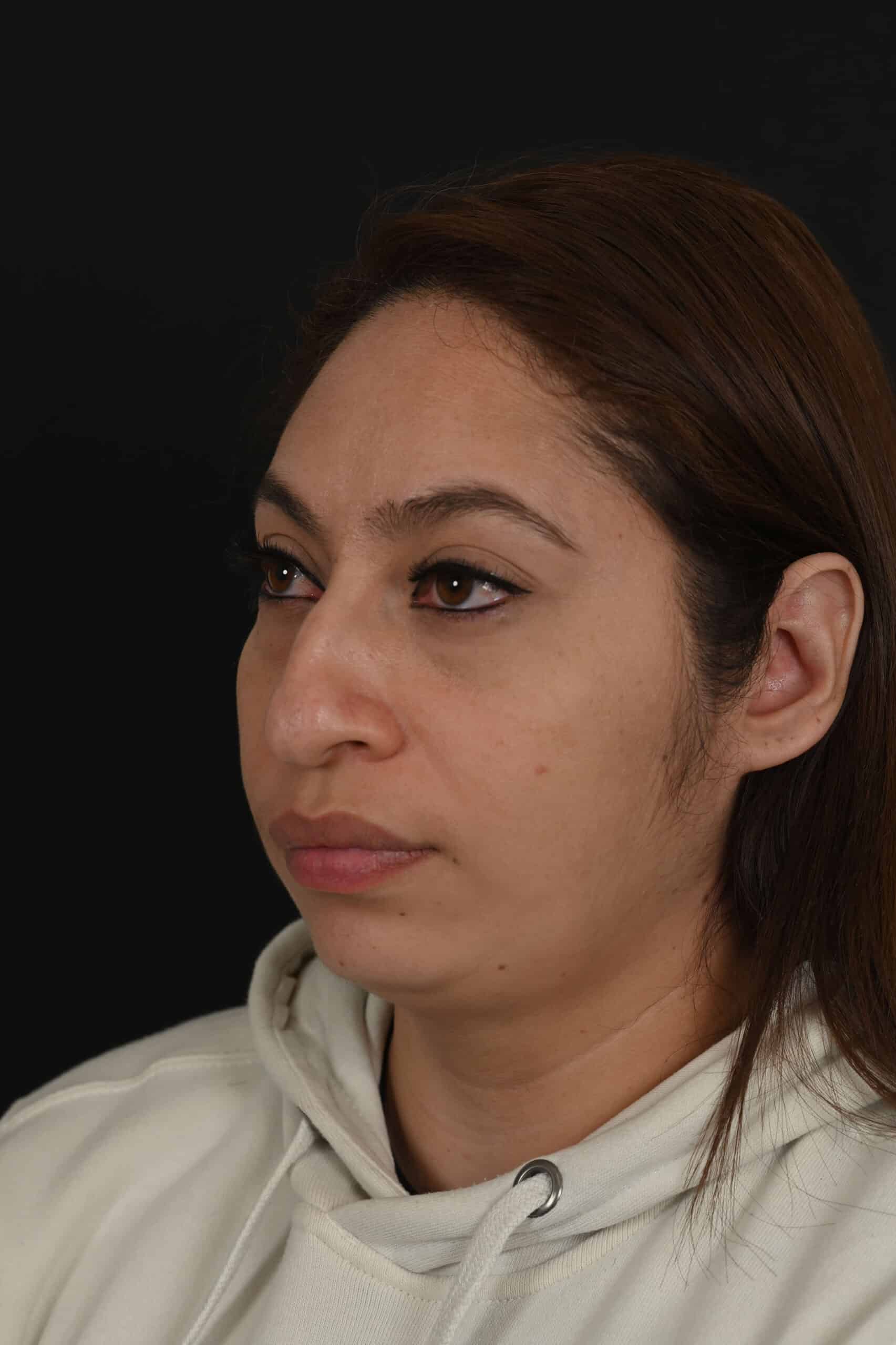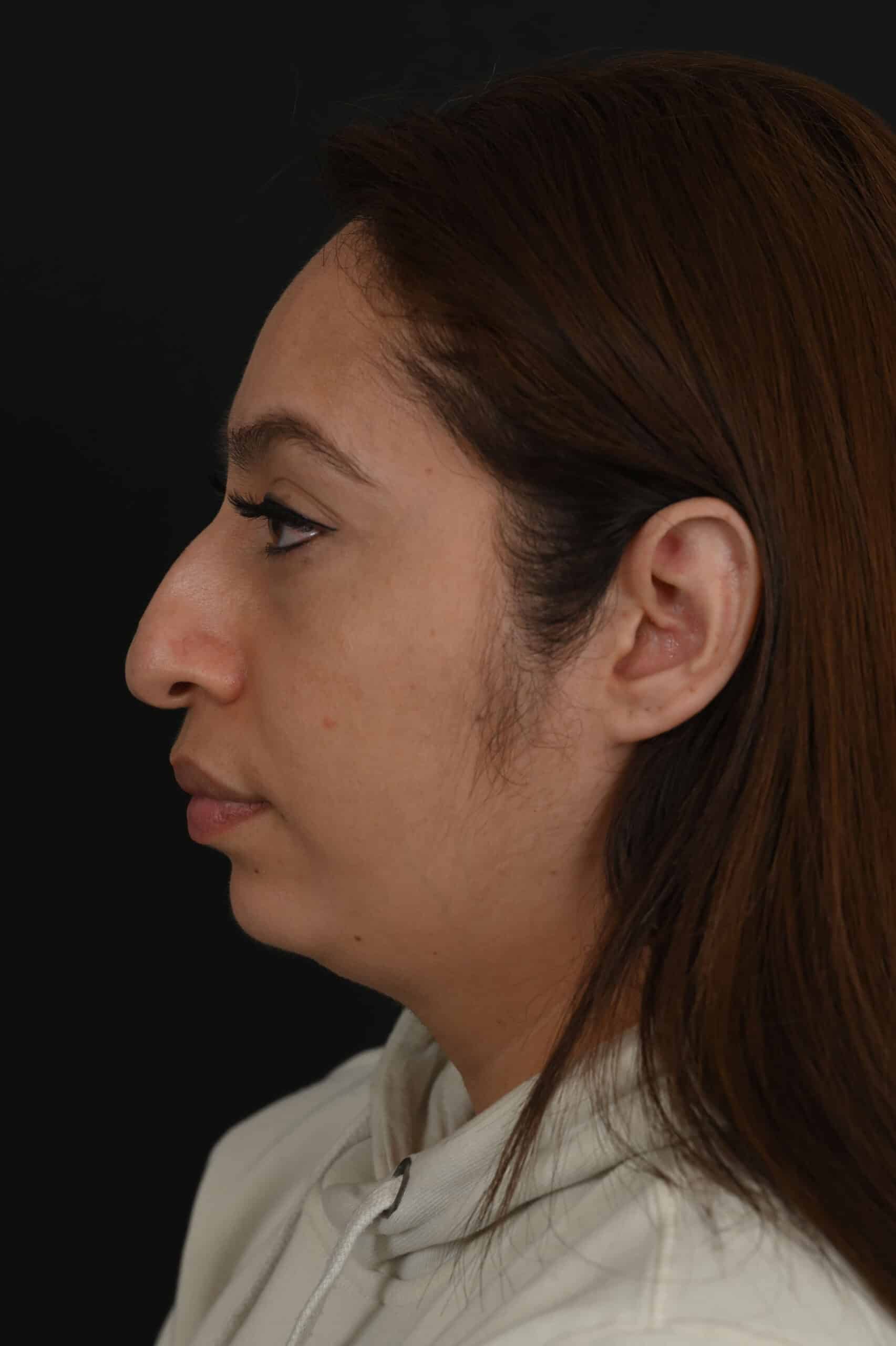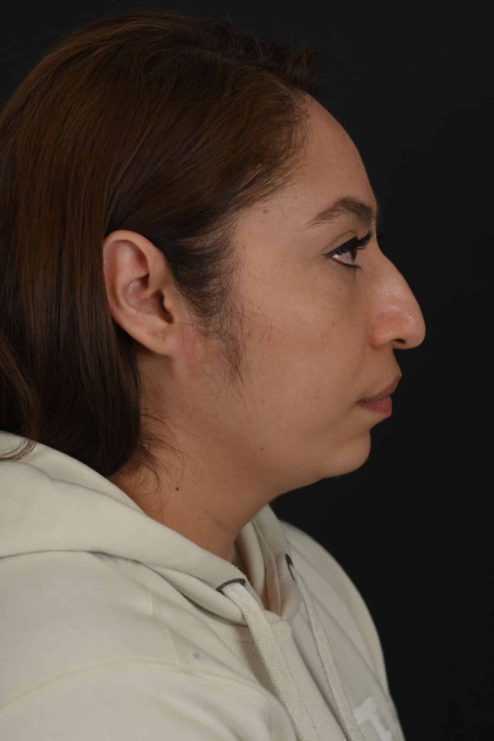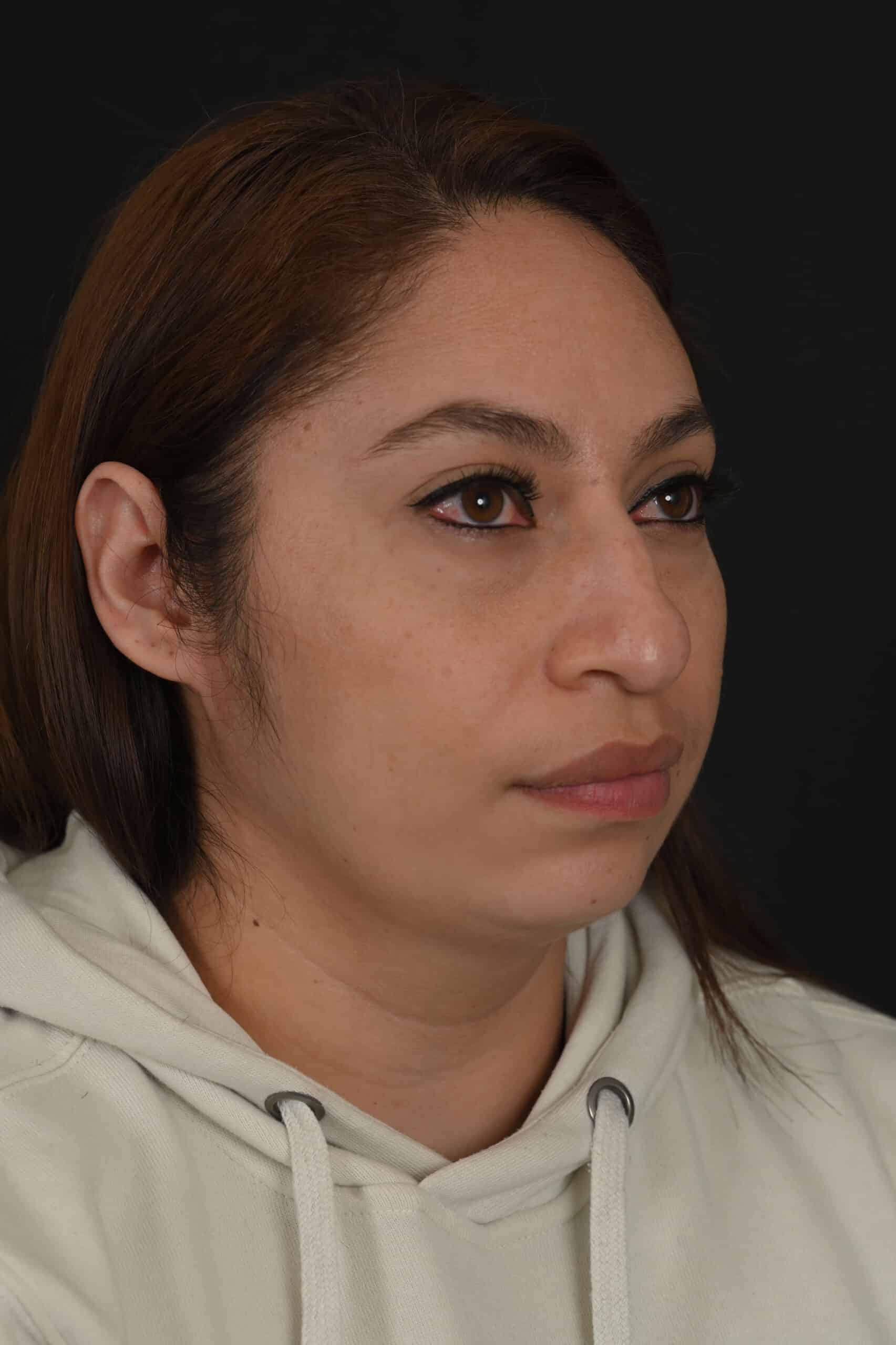 Notes from Dr. Siegel: An under-projected (short) nose with a large hump and very broad tip. Our patient wanted a more-Caucasian-looking nose. Her tip was given more projection definition. The hump was removed. She did not want a nostril reduction.