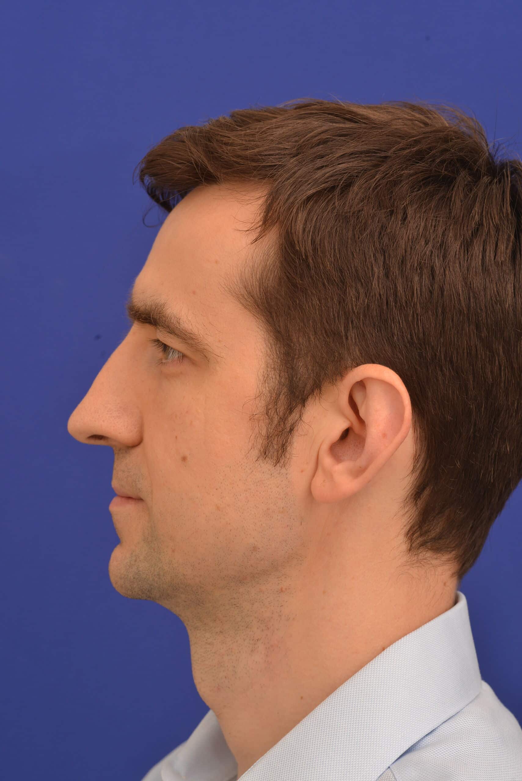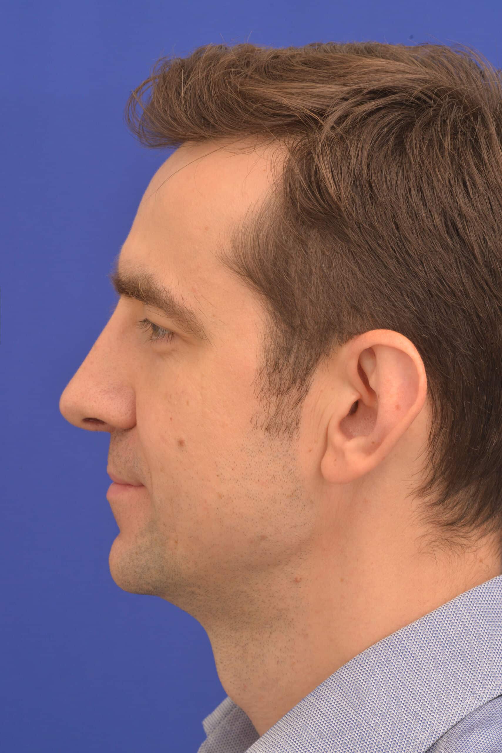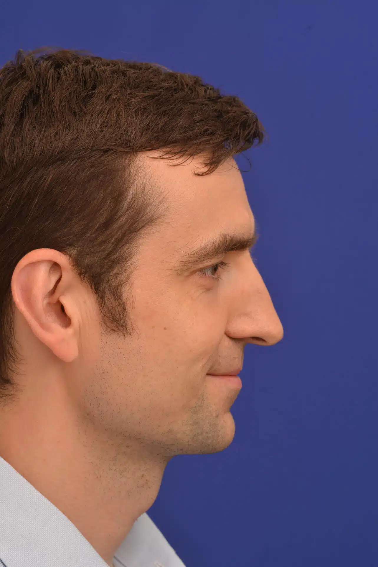 Notes from Dr. Siegel: Our patient was bothered by the appearance of a droopy nose and a small hump. Because he is 6 feet tall, he wanted to maintain a strong male nose proportionate to his stature. A rhinoplasty was performed to lift the tip of the nose conservatively, and to give him with a straight profile.