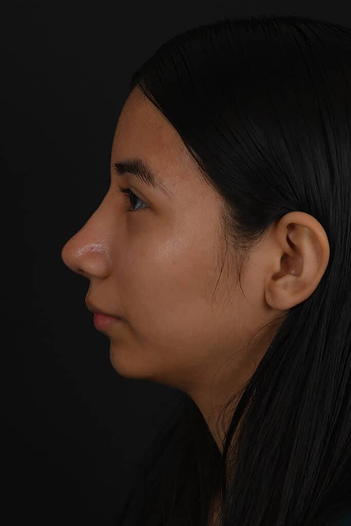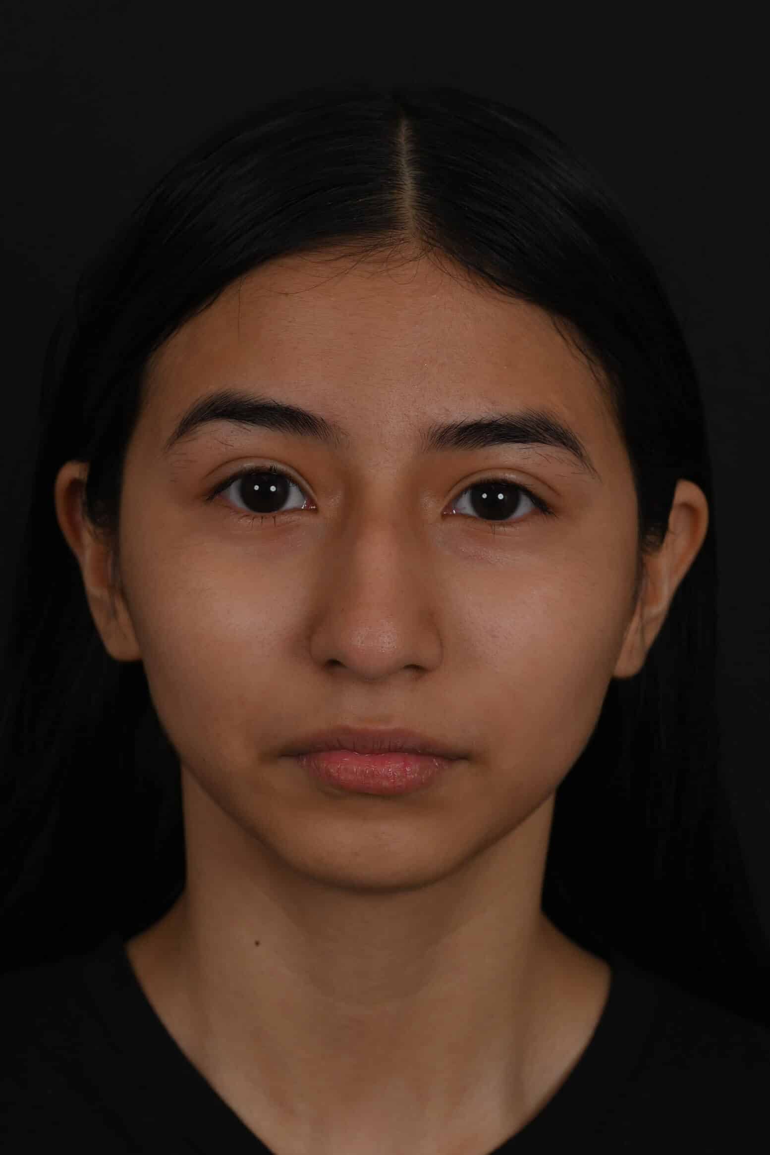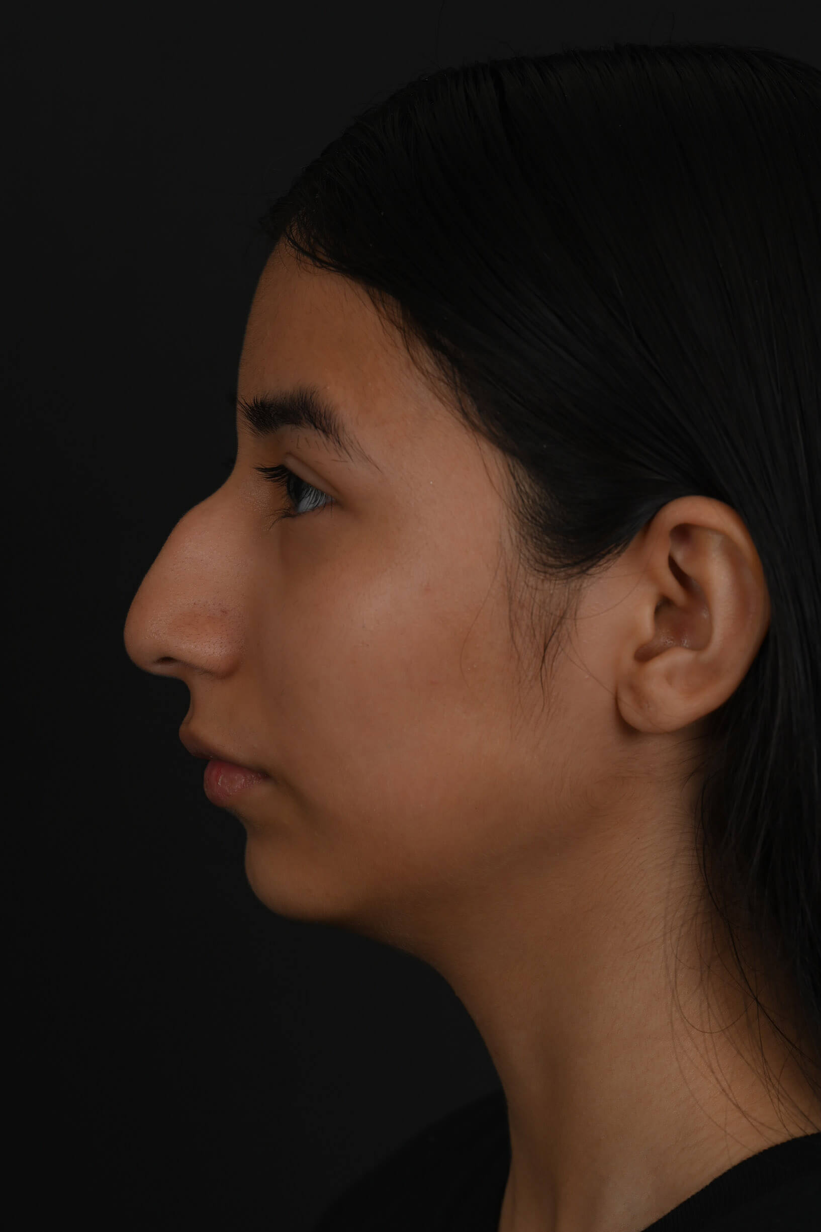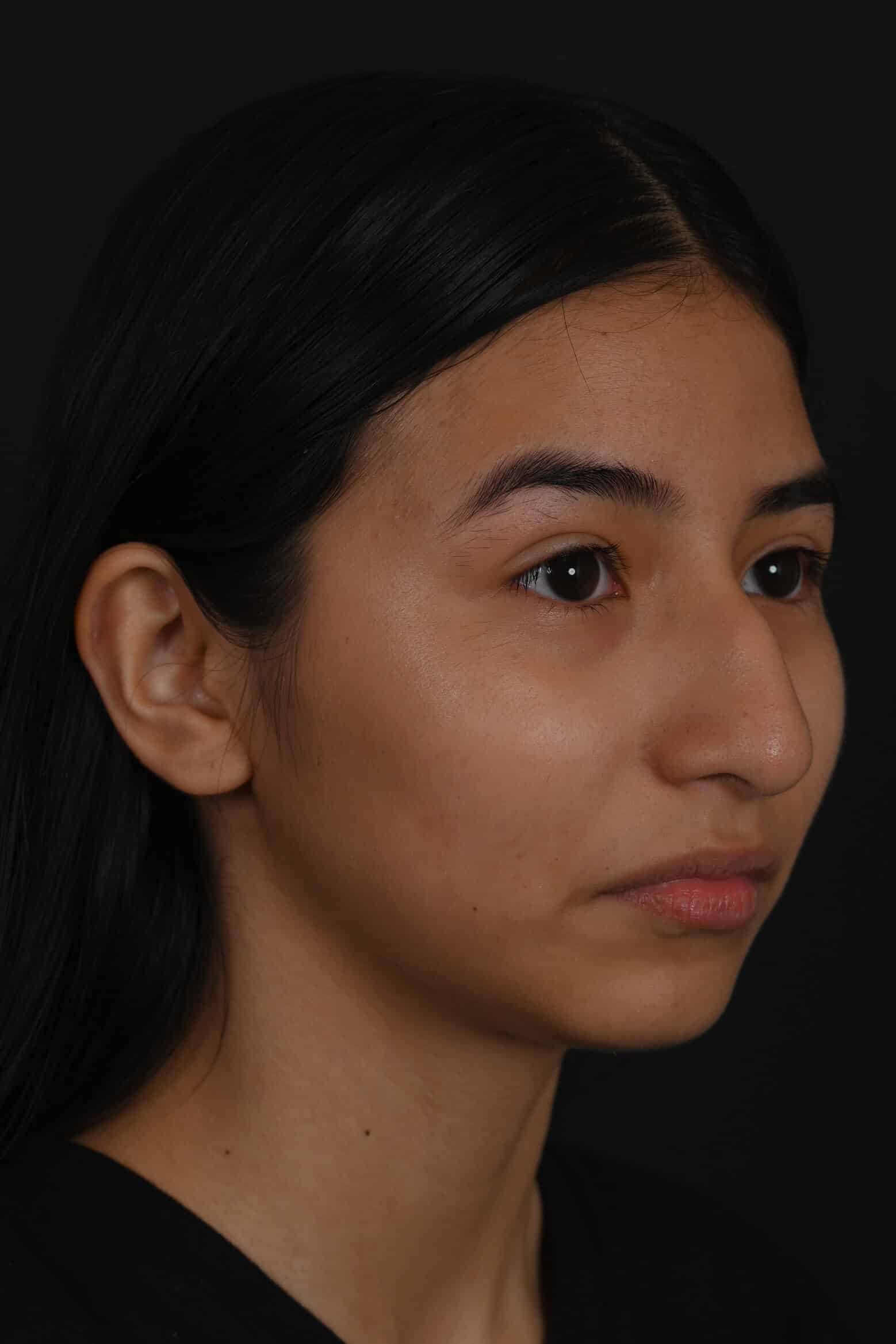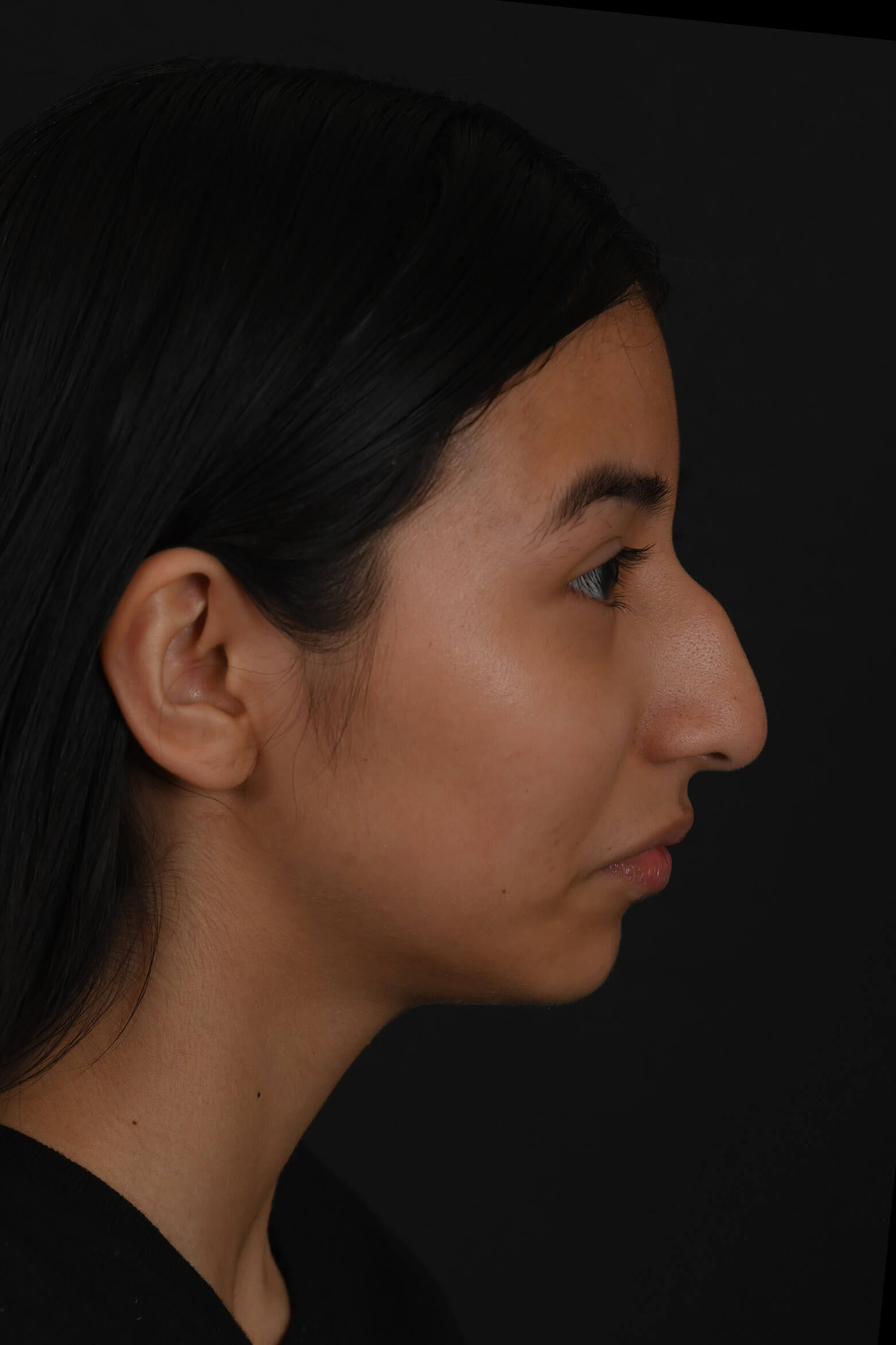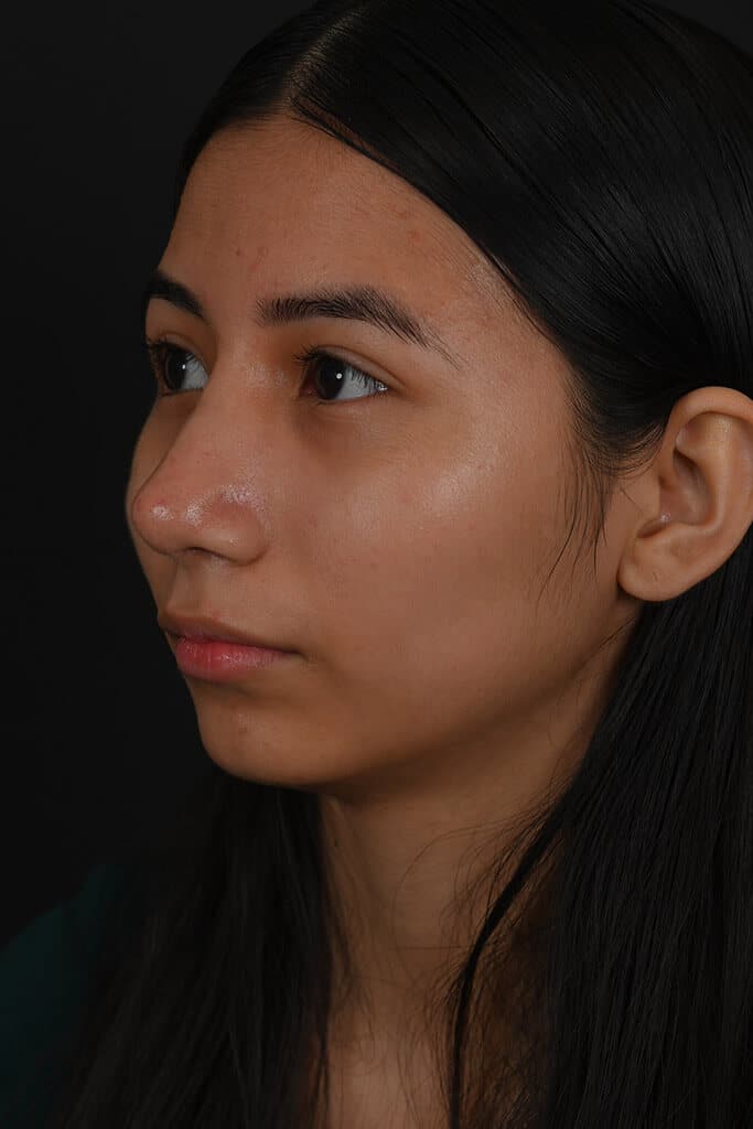 Notes from Dr. Siegel: A Hispanic girl with thick skin, our patient had a large dorsal hump and a droopy tip. The hump was removed, and the tip was lifted and shortened to give her a more balanced nose.