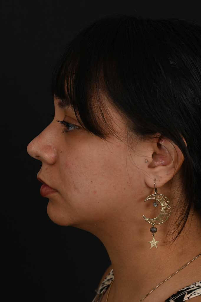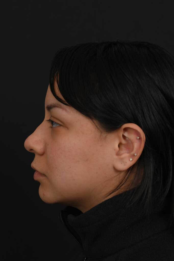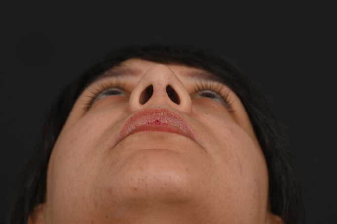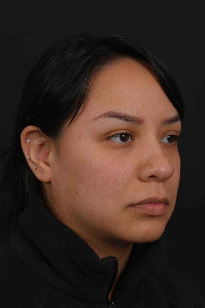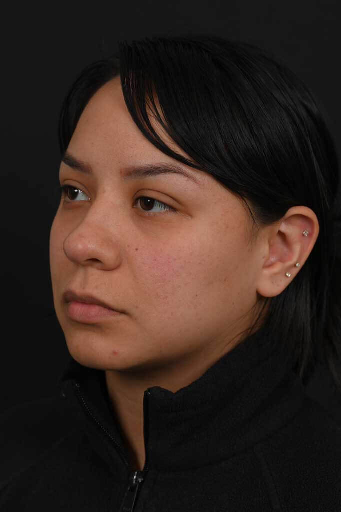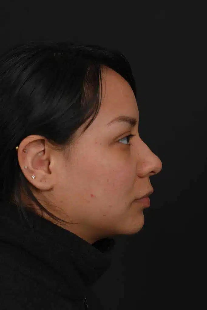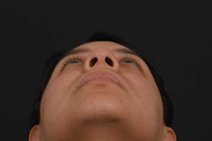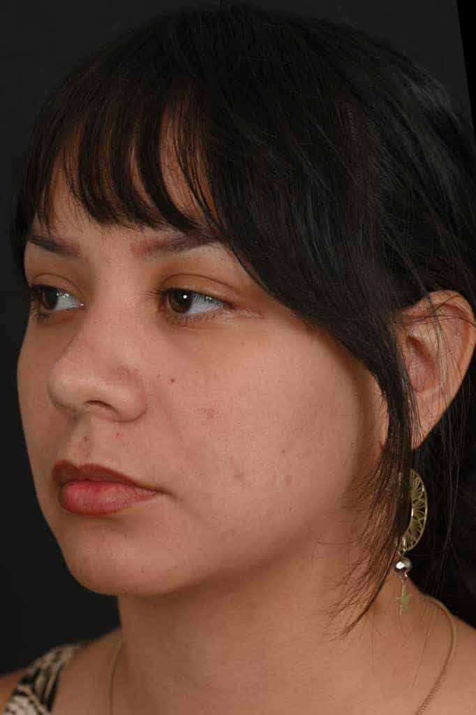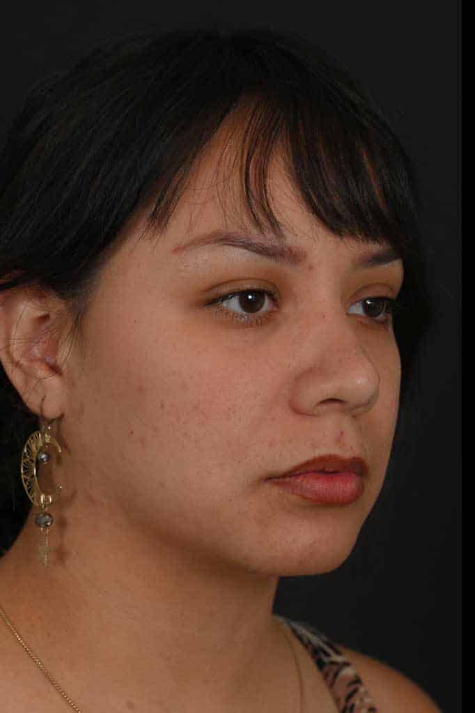Notes from Dr. Siegel: Hispanic patient with thick skin bothered by a very round nasal tip, lack of overall nose definition, and a hump. She desired a more-feminine nose with more definition and a slender profile. An ultrasonic rhinoplasty was used to reshape the bones and transform the hump into a natural profile, and to narrow the overall width of the bridge. The lack of tip definition was treated with a structural rhinoplasty approach.