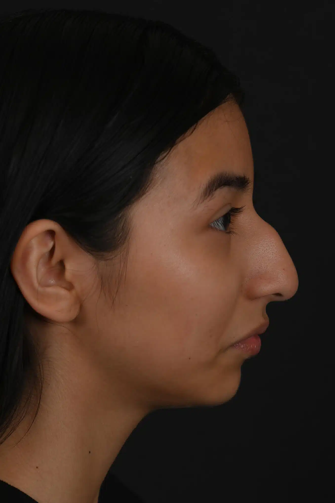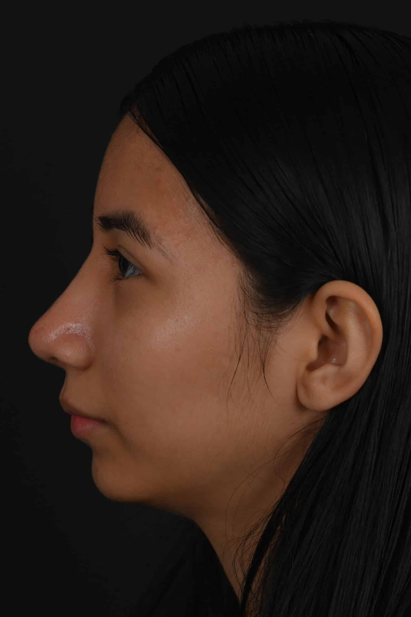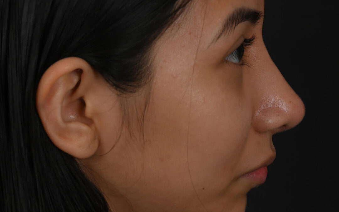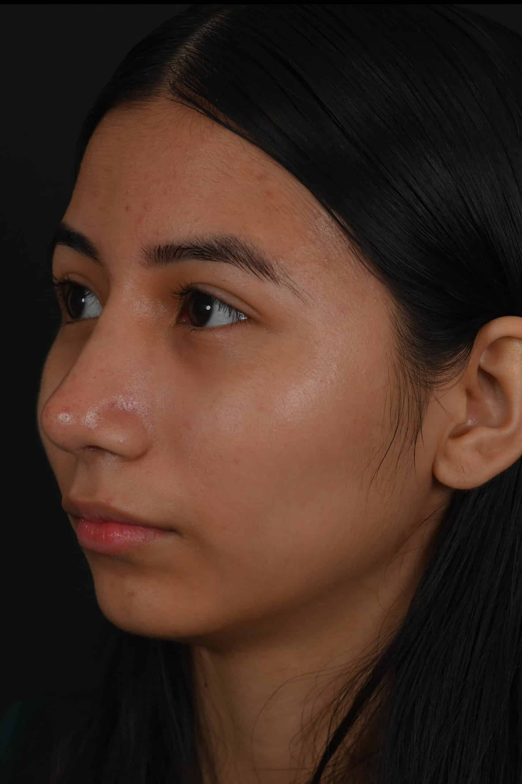 Notes from Dr. Siegel: A very petite teenage Hispanic female patient disliked the overall size of her nose. She wanted to have a more proportionate nose to balance her features and frame. She requested a slight slope to her bridge, a shorter, more-upturned, and refined nasal tip. These changes – a smaller and more feminine appearance – was achieved with the ultrasonic rhinoplasty technique.